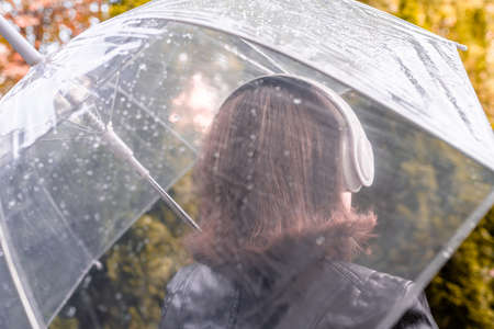 Autumn. Lonely sad woman in a headphones walking in a park, garden. View through wet transparent umbrella with rain drops. Rainy day landscape. Vintage toned