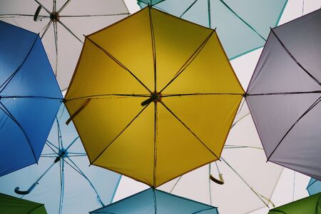Multicolored umbrellas hanging over head on the street against the blue sky and swinging in the wind.
