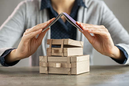 Close up of young woman hands holding open passport as roof to secure luggage. Detail of cardboard suitcases models suitcases on table with female hands holding passport protecting them. Travel and baggage insurance concept.