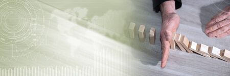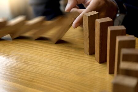 Risk and Strategy in Business, Image of hand stopping falling collapse wooden block dominoes effect from continuous toppled block, prevention and development to stability.