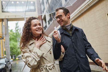 Horizontal dutch angle medium portrait of Caucasian man and woman enjoying time together outdoors walking under umbrella and talking
