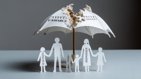 Concept of family insurance with paper shield protected by hand of insurer, geometric pattern