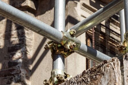 Scaffolding pipe clamp and parts, An important part of building strength to scaffold clamps in used close up on construction site,platforms for stage structure support .