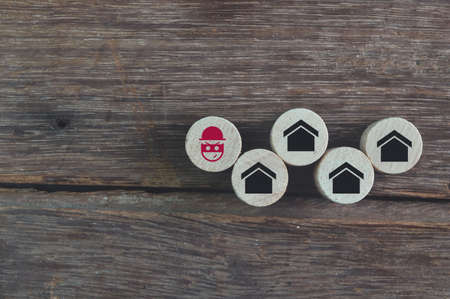 Wooden cube blocks with scammer and house symbols. Real estate scam concept