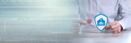 Man holding a virus and shield with a family at home; concept of family and home insurance during virus outbreak; panoramic banner