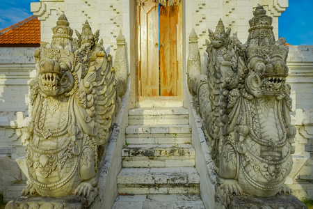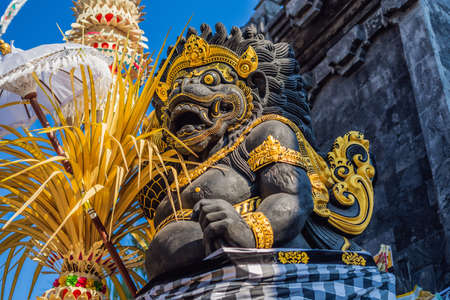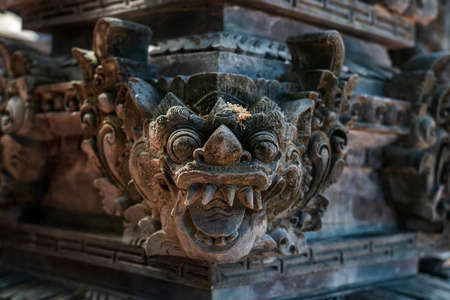 Sculptures of gods and demons carved from stone. Decor and decoration of ancient Hindu temples. Island of Bali, Indonesia.