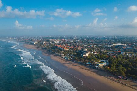 Tropical beach with blue ocean and waves in Bali island. Aerial view