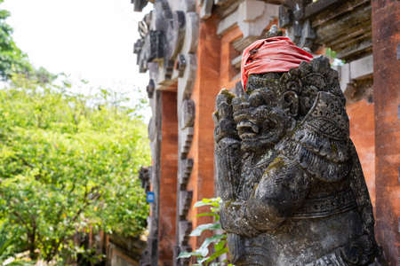Sculptures of gods and demons carved from stone. Decor and decoration of ancient Hindu temples. Monkey Forest, a sacred temple complex in Ubud on the island of Bali, Indonesia.