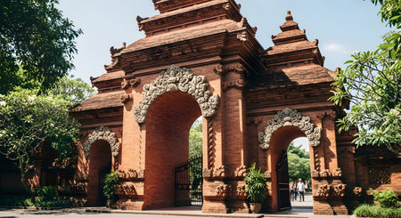 A majestic Candi Bentar, a traditional split gateway, marks the entrance to a Balinese temple in Indonesia. The intricate red brick architecture and ornate carvings stand under a clear blue sky, surrounded by lush tropical foliage.
