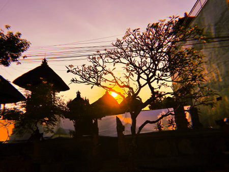 Beautiful sunset glow through silhouettes of exotic temple buildings and tropical trees. Travel Bali. Orange sun light on pink sky. Soft focus. film grain pixel texture. Defocused.
