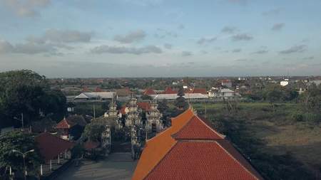 Top view of tiled roofs. Bali houses. Sunset at cozy small town
