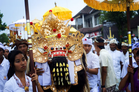 Bali, Indonesia - March 07, 2016: Balinese people in traditional clothes carry jempana or wooden litter at the procession during Balinese New Year celebrations.