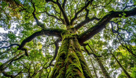 From a worm's-eye view, a thick, ancient tree trunk covered in moss displays its numerous, sturdy branches reaching towards the sky.