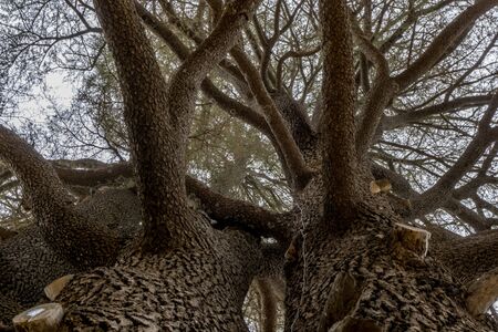 Bottom-up view of a powerful trunk and branches of an old oak tree