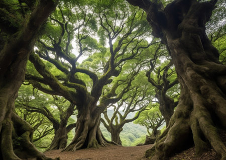 Lush ancient trees and surrounding scenery outdoors