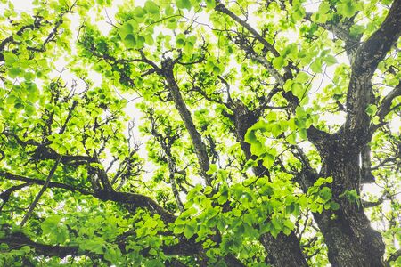 Green concept. Top tree with green Leaves shot from below and sun light.