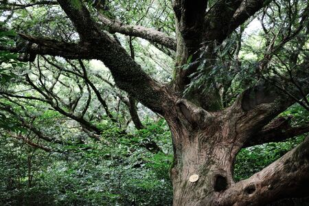 The crown of the old sacred camphor tree (yorishiro), in Shinto an object capable of attracting spirits called kami. Hirano Shrine. Kyoto. Japan