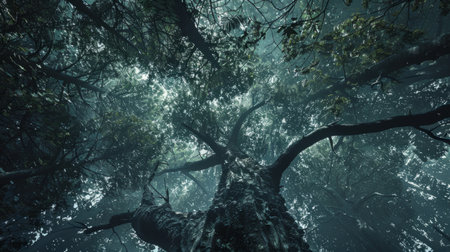 A striking perspective of a large tree captured from its base, showcasing the extensive network of branches and vibrant green leaves. The upward view reveals the tree's height against the sky, illuminated by sunlight. This image is suitable for various commercial uses, including environmental themes and nature-related content.