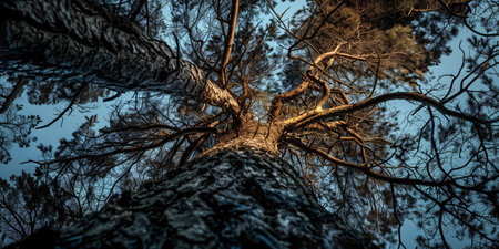Background with a textured pine tree trunk with branches spreading widely in all directions and a blue sunset sky. The trunk of a coniferous tree with an interesting pattern of branches, worm eye view