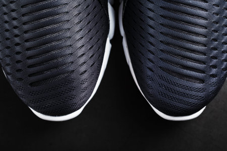 Man sport sneakers. Fashion man sneakers on black background. Top view. Copy space.