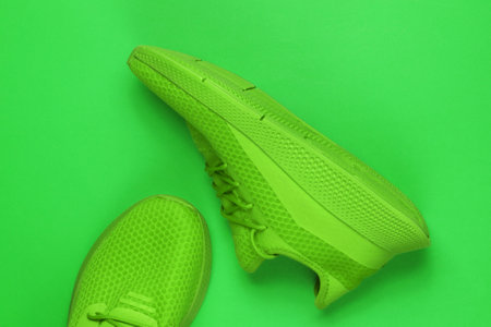 Sneakers on wrapped paper background. Color trend, minimalistic fashion still life. Top view