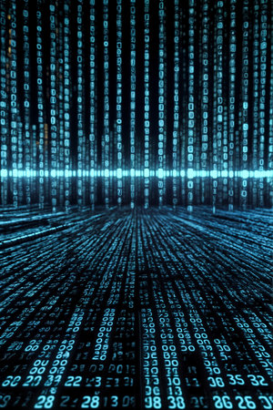 Illuminated neon green binary numbers cascade through a dark, ethereal space, creating a vibrant digital landscape.