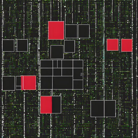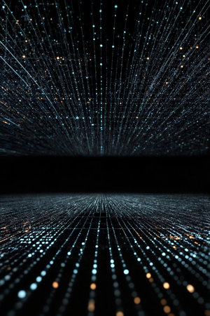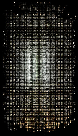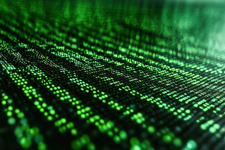 A photo depicting a multitude of green and white dots arranged on a black background, Binary code falling like rain in the Matrix, AI Generated