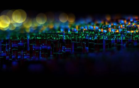 Bigdata Digital technology in global cyberspace. Blockchain network and artificial intelligence. 3D illustration of urban space in a new smart reality