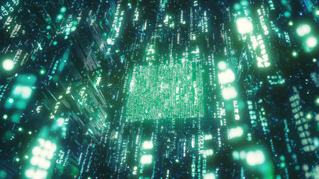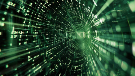 Vivid green numbers cascade in a dynamic flow, creating an immersive atmosphere reminiscent of futuristic digital realms and advanced technology.