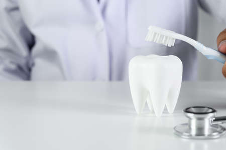Tooth and toothbrush on blue background with copy space. Dental health and oral hygiene concept