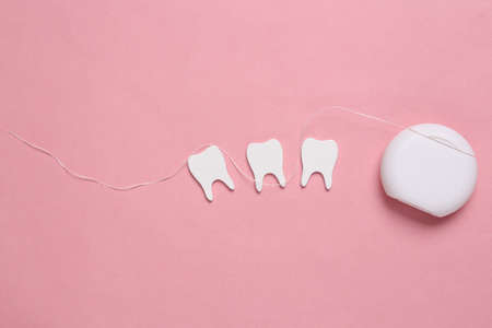 Dental care concept. Dental floss with teeth on pink background. top view. flat lay