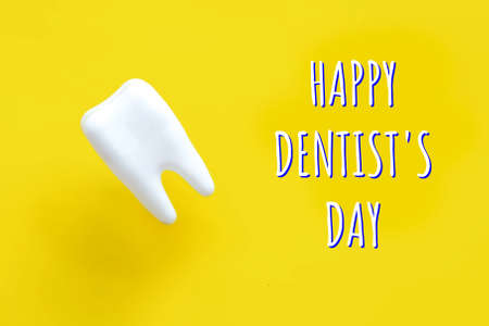 Happy Dentists Day greeting card and white tooth on yellow background.