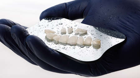 beautifully laid out ceramic veneers for the upper jaw on the mirror with a drop in the doctor's hand on a white background