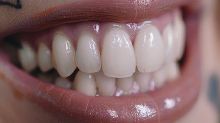 A close up view highlights smooth white teeth glistening framed by glossy shimmering lips. Teeth radiate cleanliness and shine.