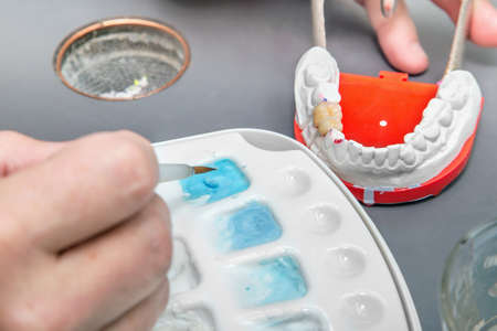 Close-up of painting work at artificial dentition with a paintbrush in a dental laboratory