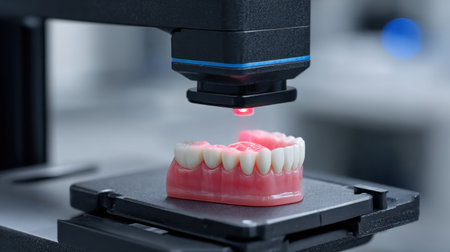 A close-up view of advanced dental scanning technology featuring a 3D printer scanning a model of human teeth, showcasing modern dental solutions in practice.
