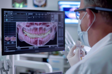 Dental x-ray image with human hand in glove and white teeth