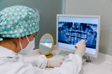 Female dentist with an x-ray on the computer pointing out the molars to be extracted