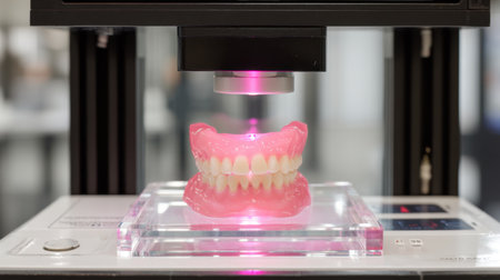 This image captures a cutting-edge 3D printing machine in action, showcasing a detailed dental model with vibrant pink hues, emphasizing innovation in dental technology.