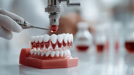 This image captures a dental professional applying liquid to a detailed teeth model, highlighting advanced technology and precision in a clinical environment.