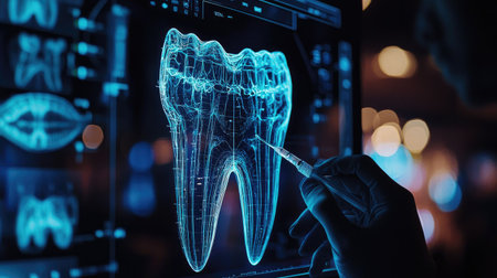 A healthcare professional analyzes a digital 3D model of a tooth using a diagnostic tool. The futuristic representation highlights anatomy and promotes effective treatment strategies.