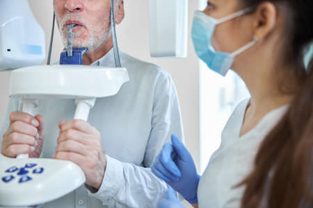 Professional oral surgeon getting a patient ready to have a panoramic dental x-ray exam