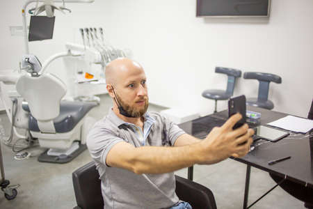 Scared caucasian male is taking selfie in a modern dental clinic and waiting for a teeth check up.