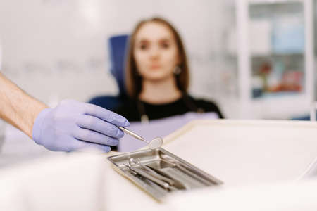 Young adult woman have a visit in the dentist clinic. Conception of stomatology.