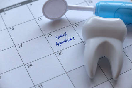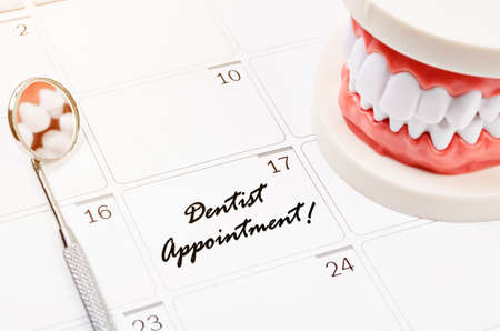 Dentist appointment word on calendar page and Dentist mirror tool and dentist demonstration teeth model.