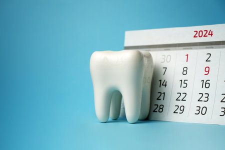 Dentist's day calendar and tooth on blue background. 3D Rendering
