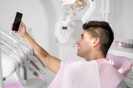 Happy patient taking selfie at dental clinic. Patient is holding smartphone and showing his healthy smile.