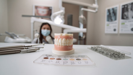 A dental clinic shows a model of teeth on a table with dental tools nearby. A dental professional wearing a mask stands in the background. Light illuminates the space.