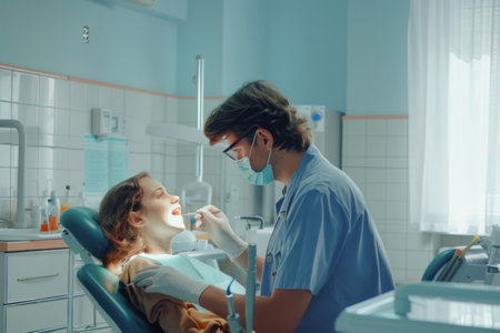 Dentist doing a dental treatment on a female patient. Surgery close-up.