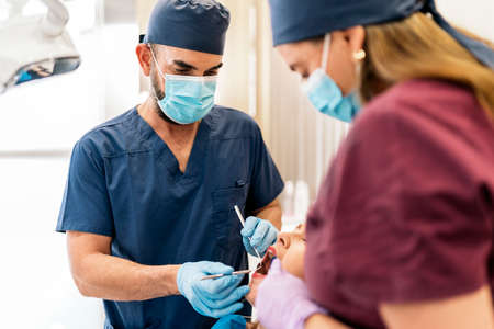 A male dentist with dental tools drills the teeth of a patient with an assistant. The concept of medicine, dentistry and healthcare.